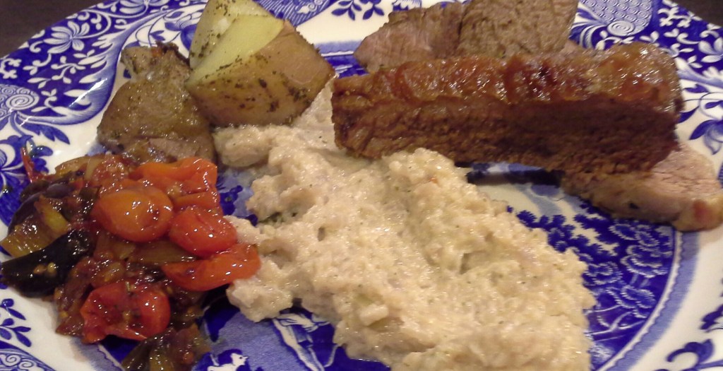 Supermarket ingredients: Boneless lamb shoulder, bay leaves, rosemary, potatoes, black olives, cherry tomatoes, cauliflower, cream, shallots, duck fat, garlic, celery, carrot, onion, butter