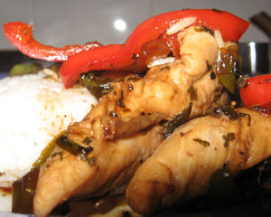 Sauté chicken in Macadamia Nut Oil and Taste Australia Swagmans Salt until browned and cooked through. Remove from pan, set aside and keep warm. Then add to the pan Cuttaway Creek Raspberry Wine Vinegar, honey and soy sauce. Cook over medium heat, stirring. Then add capsicums and shallots and cook for 2 minutes before returning the chicken to the sauce.