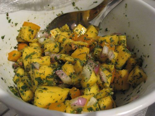 Peel and cube one mango, add half a cubed capsicum, one cubed red onion – place all in a bowl and then mix 3 tablespoons Macadamia Oil, 2 Tablespoons dried Sea Parsley, 1 teaspoon Swagmans Salt, the flesh of 1 Native Tamarind (or equivalent puree concentrate) and add to the salsa ingredients. Cover and stand for at least half an hour to allow ingredients to infuse.