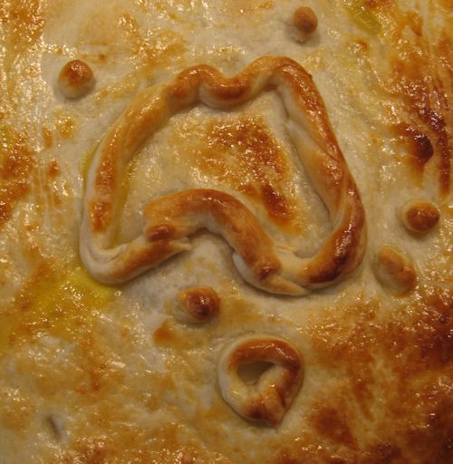 Grease and line a pastry dish with puff pastry. Add the onion mix. Place puff pastry on top and brush with egg mixture.