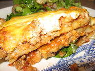 Now spoon the meat filling into each cannelloni tube and place each filled tube onto the white sauce bed. When the white sauce bed is covered with filled tubes then pour the remaining filling over tubes, top with the remaining white sauce and cover the whole lot liberally with grated cheese. Bake in 180C oven for approx 30 minutes.