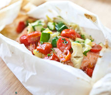Place fish fillet on parchment paper (1 per person) Spoon mixture on top. Seal the package.